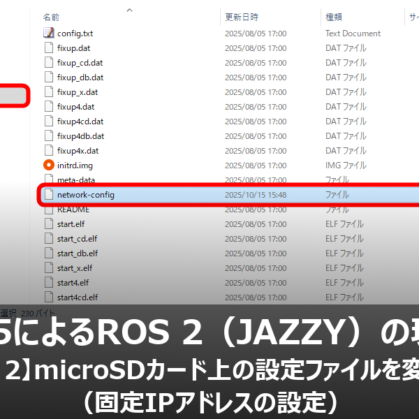 microSDカード上の設定ファイル[network-config]を変更して、固定IPアドレスを設定する手順を解説します。