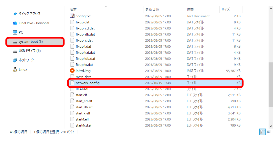 前述のWi-Fiに関する設定は、ブートパーティションの最上位ディレクトにあるネットワーク関連の設定ファイル[network-config]に保存されています。ブートパーティションは、ファイルシステムがFAT32なので、そのままWindowsにマウントしてファイルへアクセスできます。図1-2は、エクスプローラーで表示したようすです。