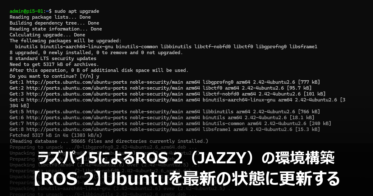 Raspberry pi 5にインストールしたUbuntuを最新の状態に更新する手順を解説します。更新の主な流れは、最新パッケージリストの取得・パッケージの更新・不要なパッケージの削除、そしてキャッシュの整理です。