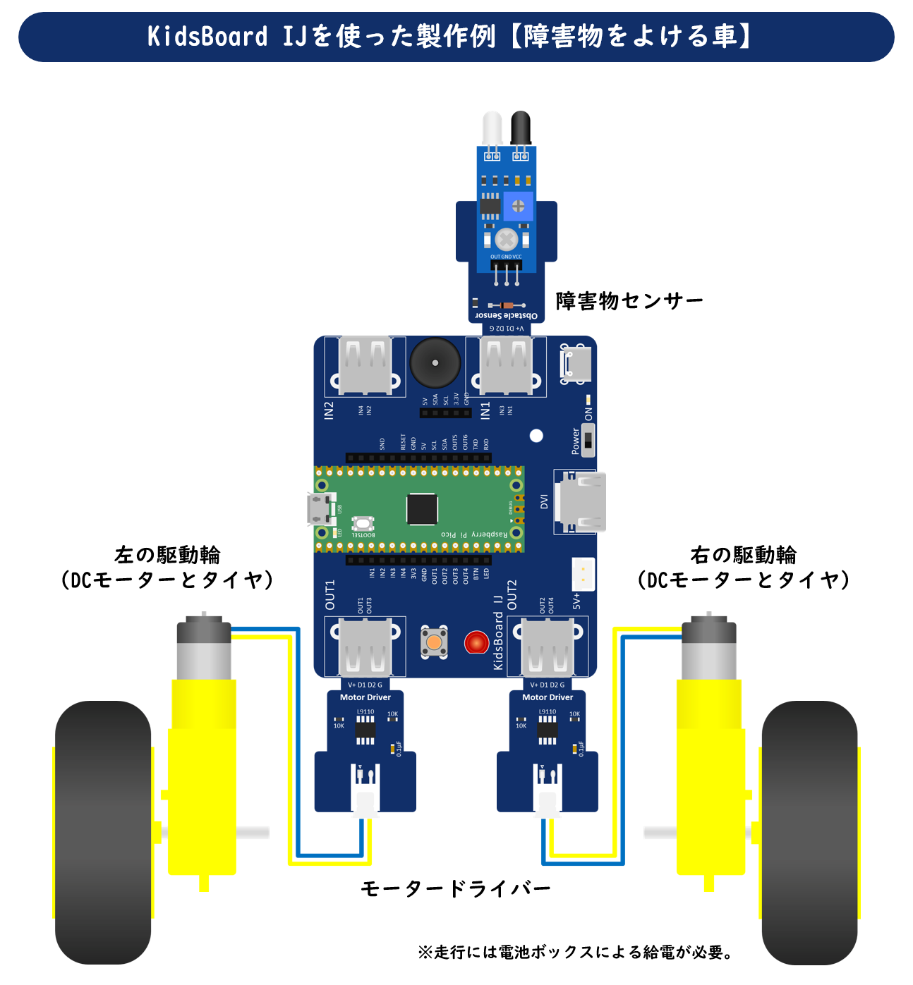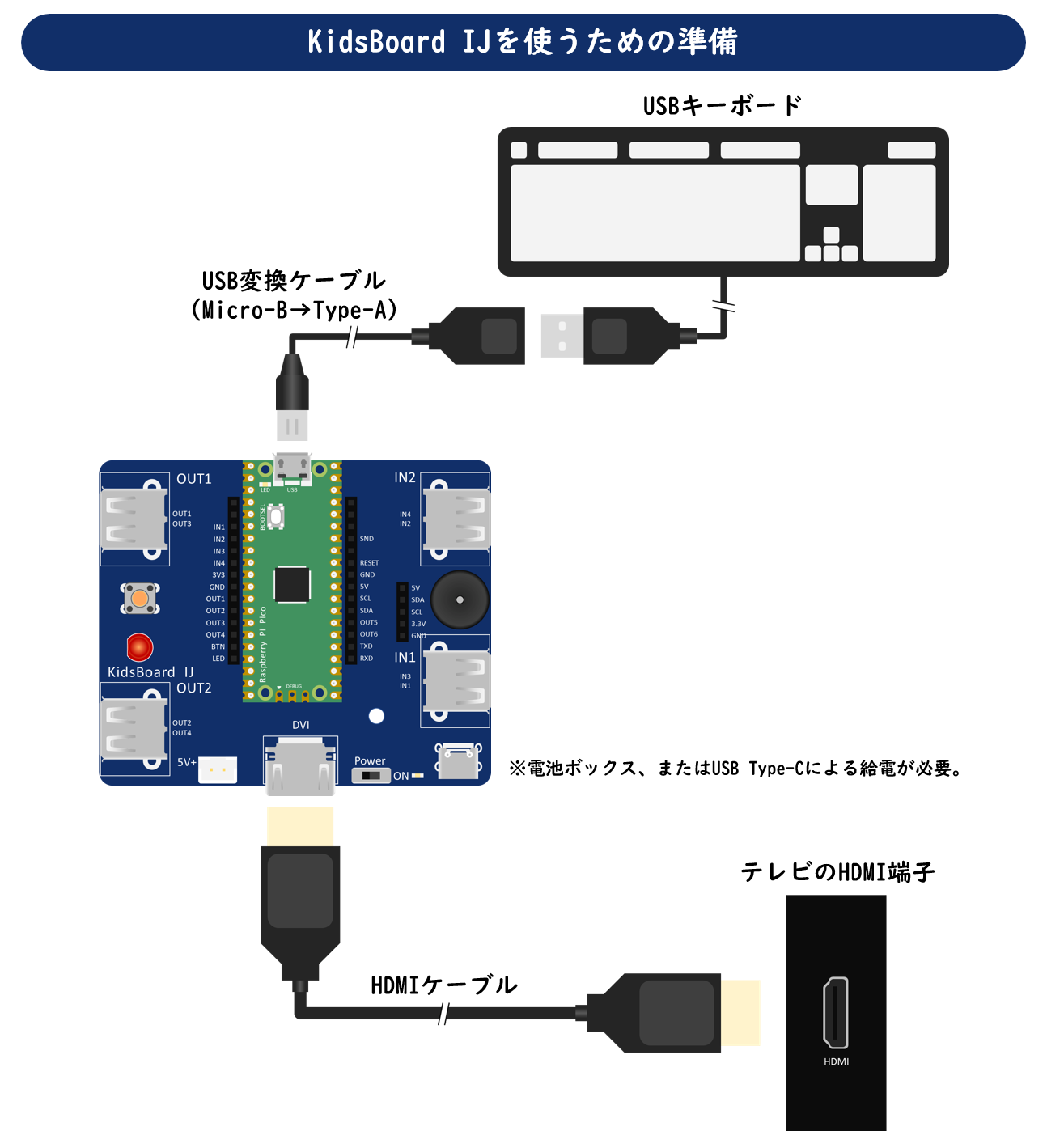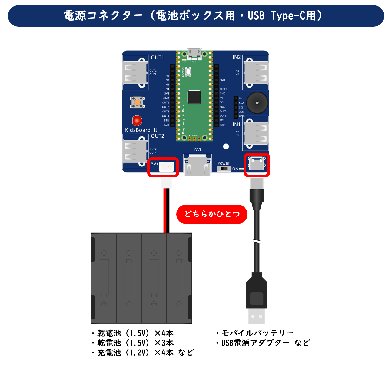 KidsBoardIJを動かすための電源として、電池ボックス、またはUSB Type-Cによる給電が必要です。それぞれの電源コネクターがあるので、どちらかひとつを接続します。電池ボックスの場合、4.5V~6Vの範囲で給電します。例えば、乾電池(1.5V)×4本、乾電池(1.5V)×3本、充電池(1.2V)×4本などです。USB Type-Cの場合、モバイルバッテリー、またはUSB電源アダプターなどから給電します。