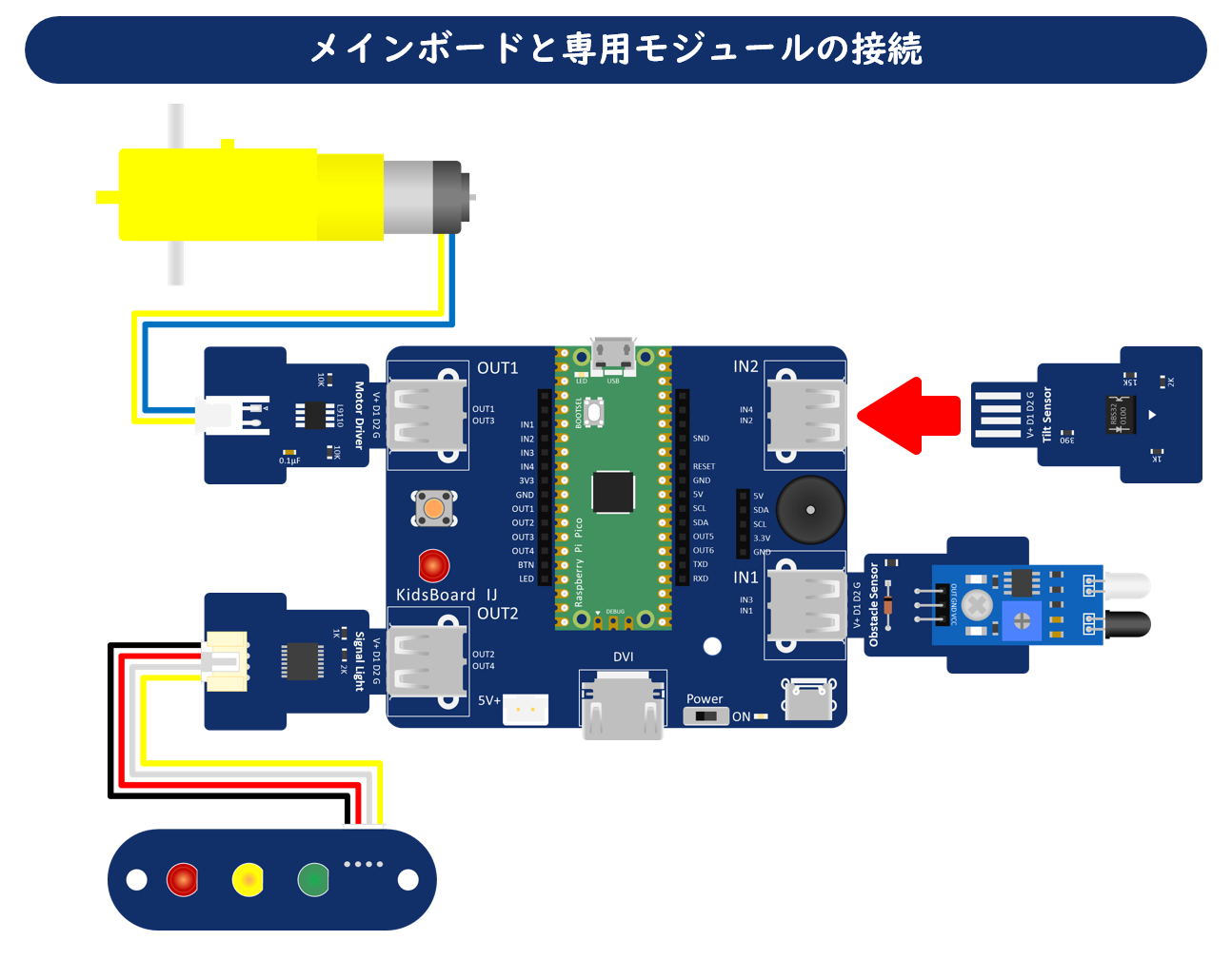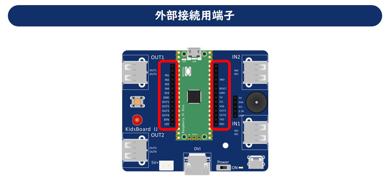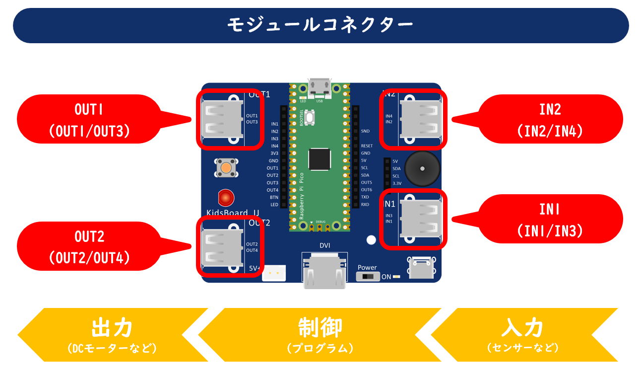 各種センサーやDCモーターなどの専用モジュールを取り付けるコネクターです。モジュールコネクターには、入力(IN1/IN2)と出力(OUT1/OUT2)の2種類あり、それぞれ2個ずつ搭載しています。入力側には、障害物センサーや明るさセンサーなどのセンサー、出力側には、DCモーターやサーボモーターなどを取り付けます。KidsBoard IJでは、コンピューターによる制御の基本要素である入力・制御・出力の3つが、ボードの右側から順番に並んでいるため、とても理解しやすくなっています。