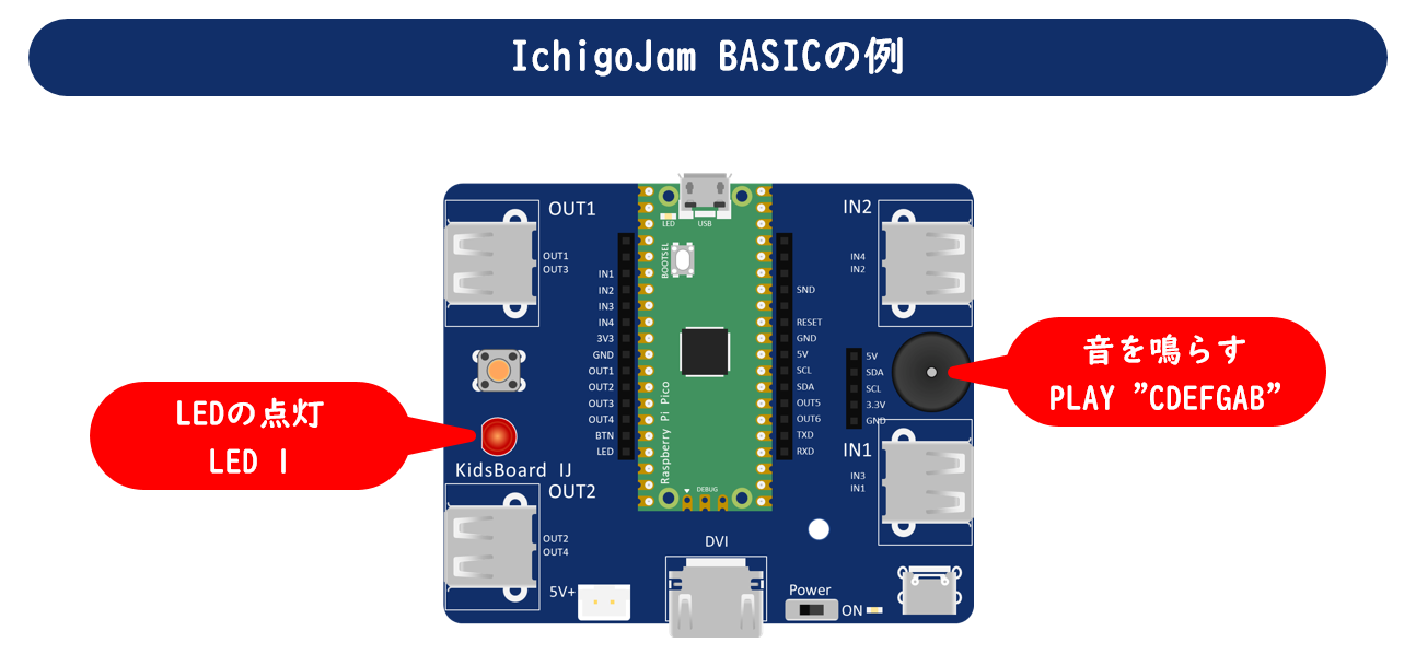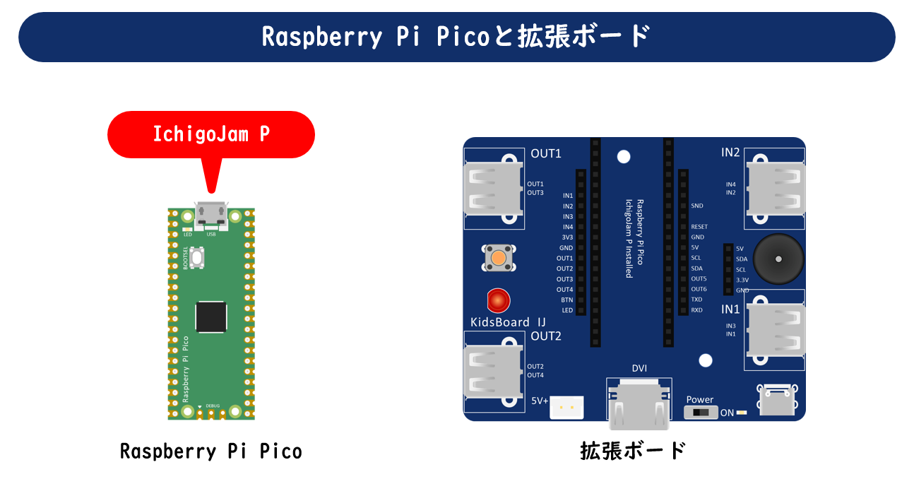 KidsBoard IJは、Raspberry Pi Picoと呼ばれる小型のマイコンボードと、モジュールコネクターやスピーカー、LEDなどを搭載した拡張ボードで構成されています。Raspberry Pi Picoには、プログラミング言語であるIchigoJam BASICの実行環境を提供するIchigoJam Pという専用ソフト(ファームウェア)が書き込み済みなので、すぐにIchigoJam BASICが使えます。