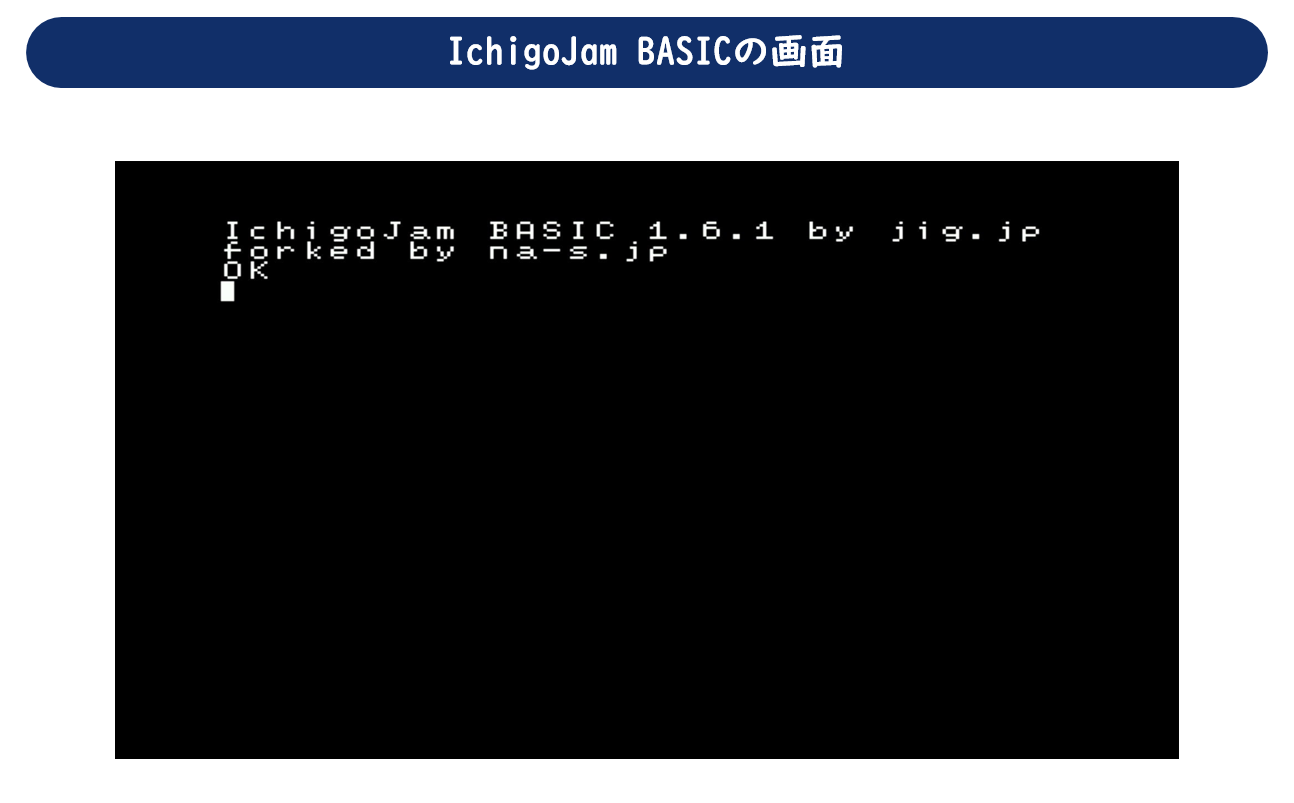では、IchigoJam BASICの画面を見てみましょう。黒背景に白い文字が基本的なIchigoJam BASICの画面です。KidsBoard IJの電源を入れると、画面上にバージョン情報が表示され、その後に[OK]が表示されます。点滅する白い四角が文字の入力位置を示すカーソルです。横32文字、縦24行です。