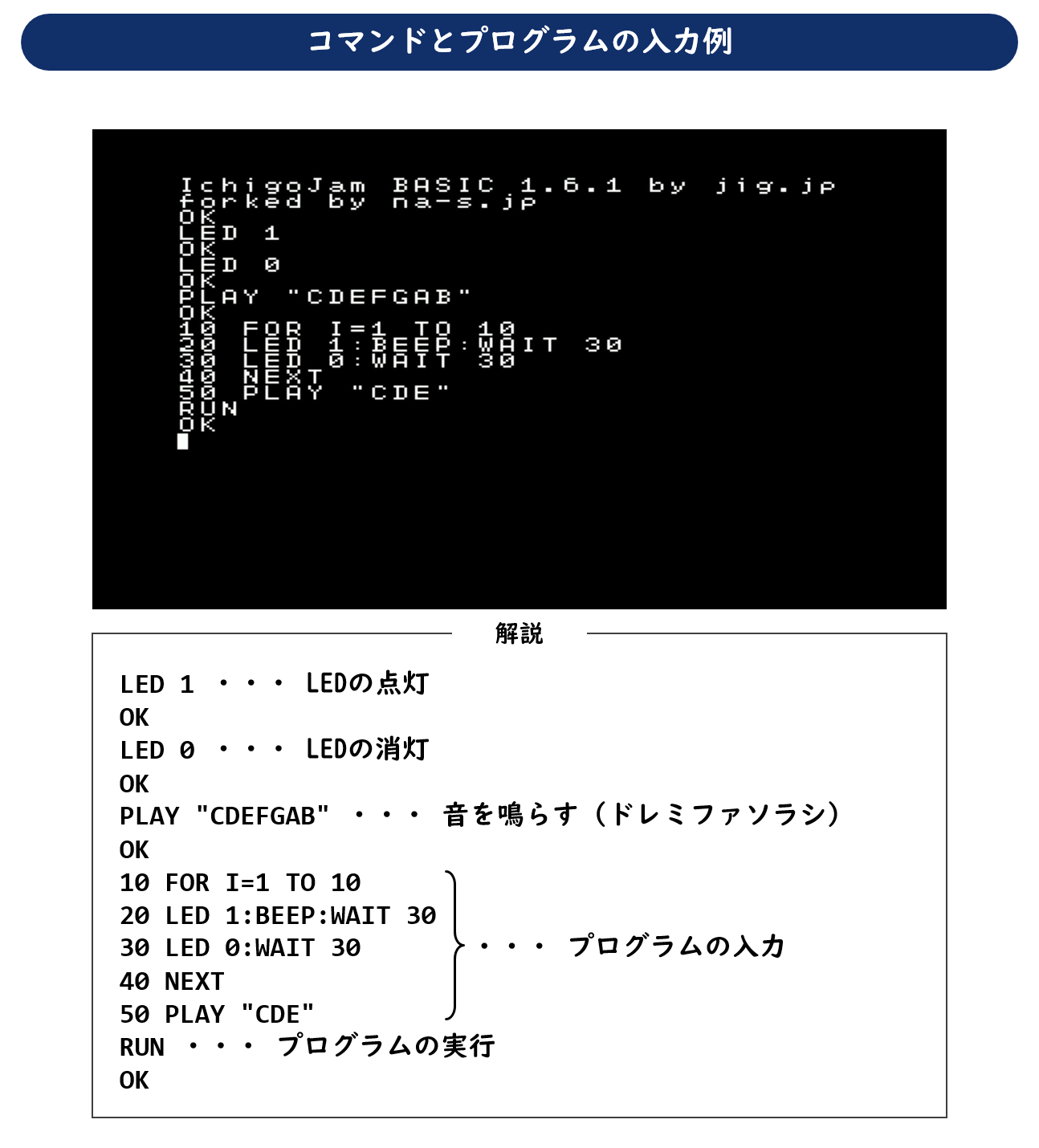 次に入力例です。[LED 1][LED 0][PLAY "CDEFGAB"]の行が、IchigoJam BASICの命令語です。行番号をつけずに入力するとコマンドとして解釈され、入力後に[ENTER]キーを押すことですぐに実行されます。正しく実行されると[OK]が表示されます。その後に続く10~50の行番号がついた5行がプログラムです。行番号をつけることでプログラムの一部として解釈され、プログラムエリアに記憶されます。[RUN]コマンドを入力すると、行番号の順に実行されます。プログラムが正しく終了すると[OK]が表示されます。