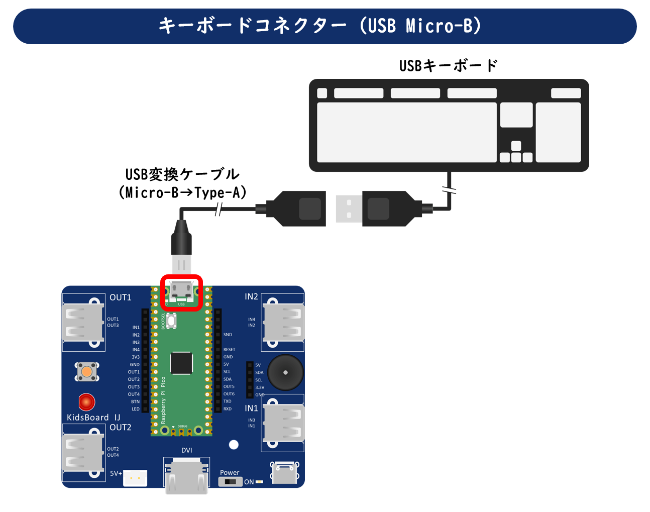 Raspberry Pi PicoのUSB Micro-BコネクターにUSBキーボードを接続します。一般的なUSBキーボードのコネクターはUSB Type-Aのため、そのままでは接続できません。USB変換ケーブル(Micro-B→Type-A)を用意しましょう。