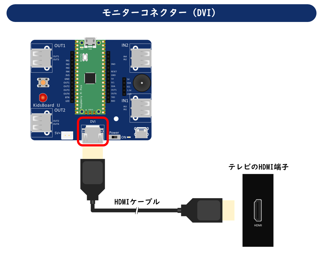 KidsBoard IJのモニターコネクターは、見た目はHDMIですが、内部信号にはDVI(DVI-D)を採用しています。違う規格なのにHDMIケーブル一本でなぜ映るの?と不思議に思うかもしれません。実は、HDMIはもともとDVI(DVI-D)をベースに設計された規格。そのため、DVI(DVI-D)の映像信号と下位互換があり、変換なしで接続できるのです。ただし、DVI(DVI-D)のため音声信号は出力されません。