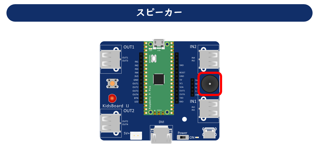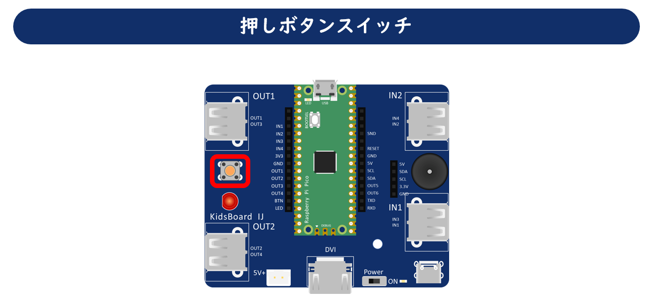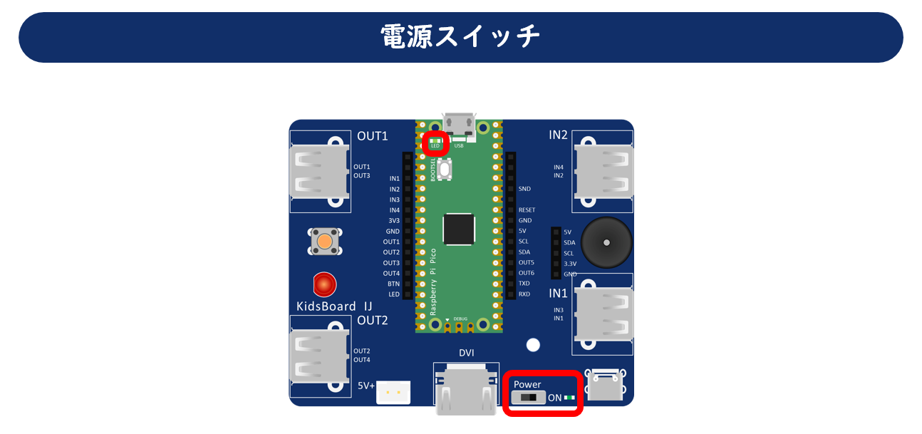 電源スイッチです。オンにすると、電源スイッチ右側のLEDと、Raspberry Pi Pico上のLEDが点灯します。