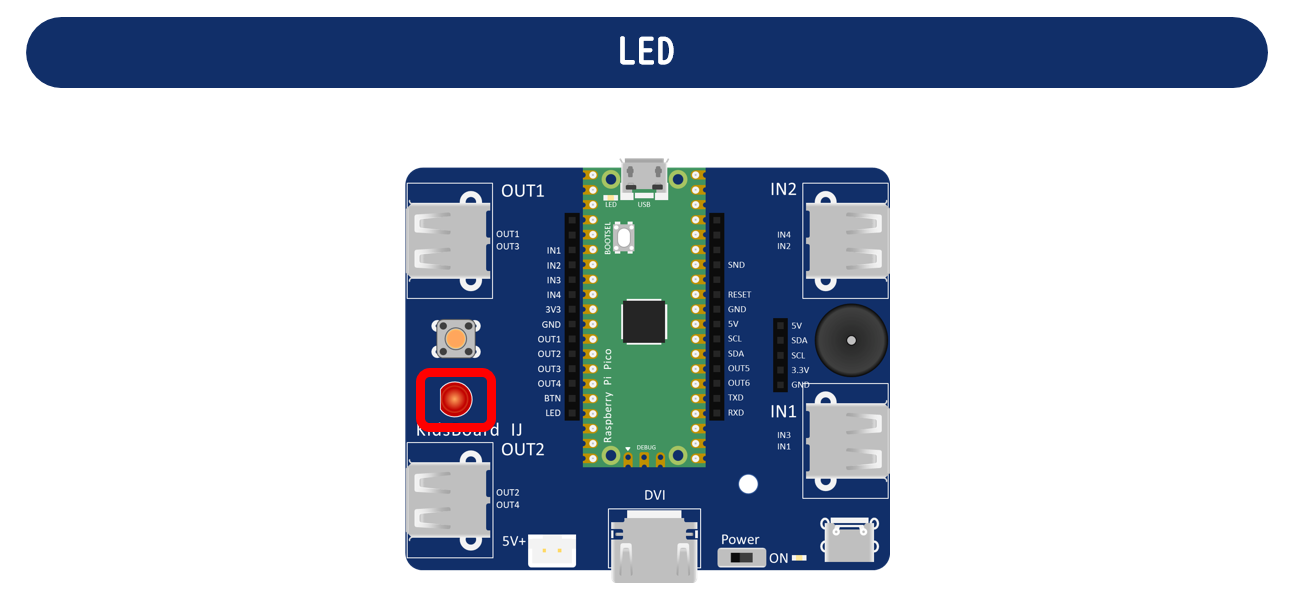 [LED]コマンドで点灯・消灯できる赤色のLEDです。
