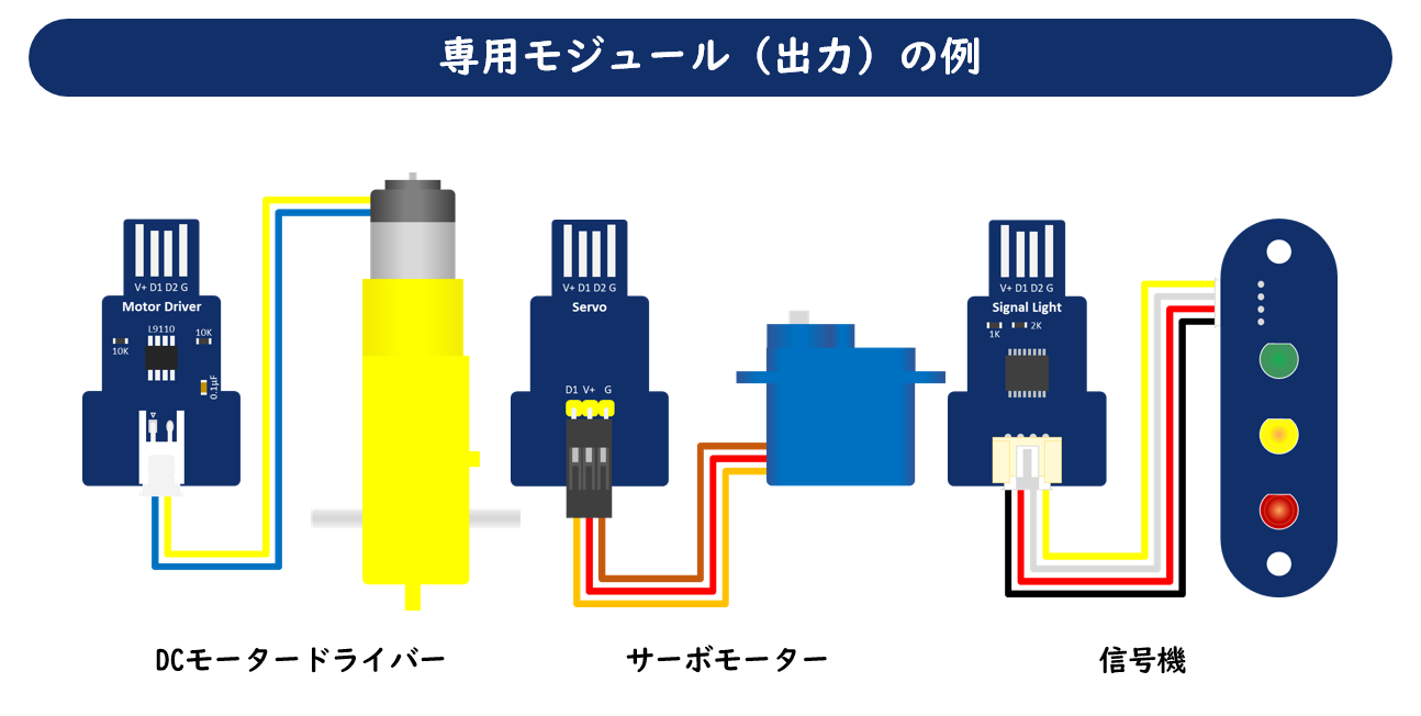 出力側に取り付ける専用モジュールです。[OUT]コマンドでDCモーターや信号機などを制御できます。