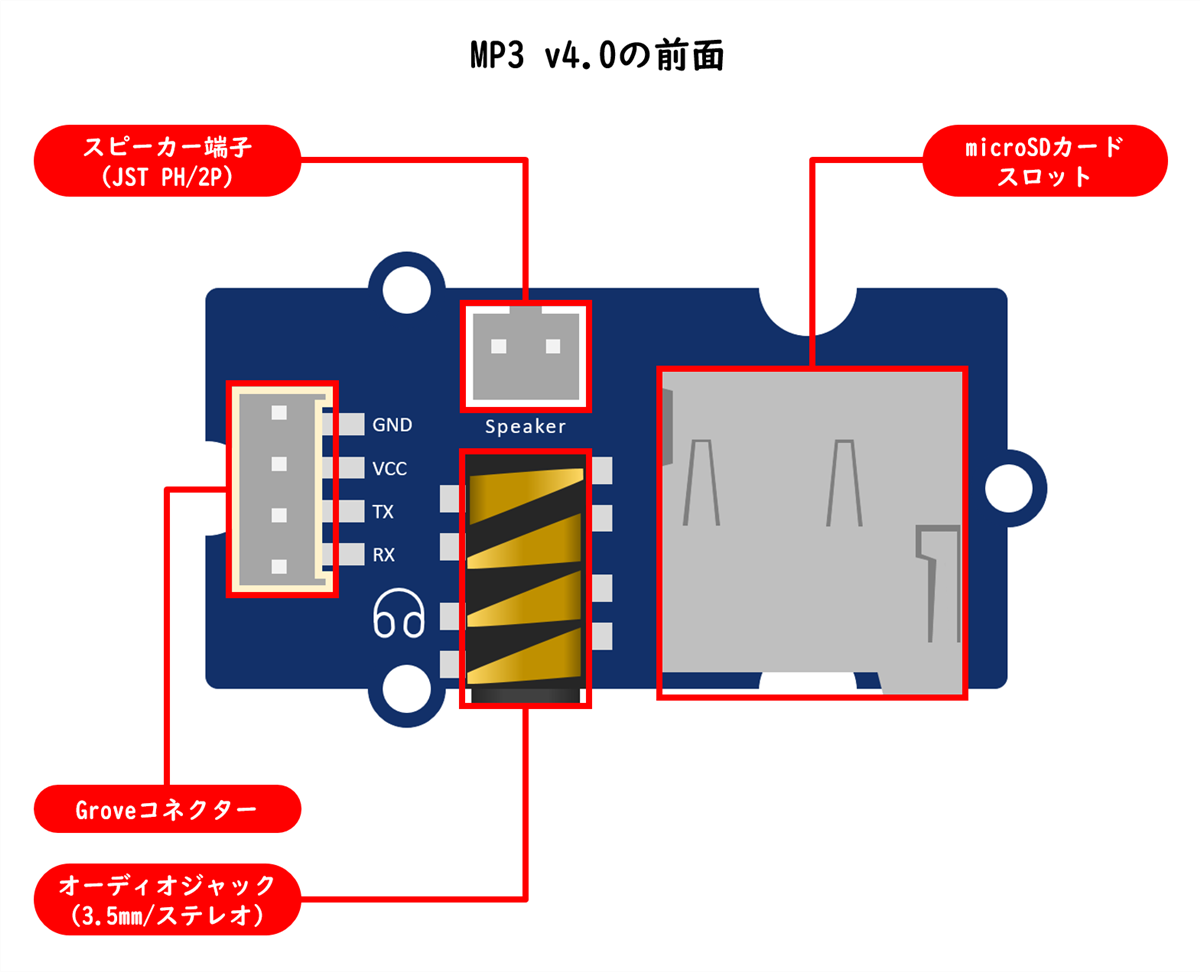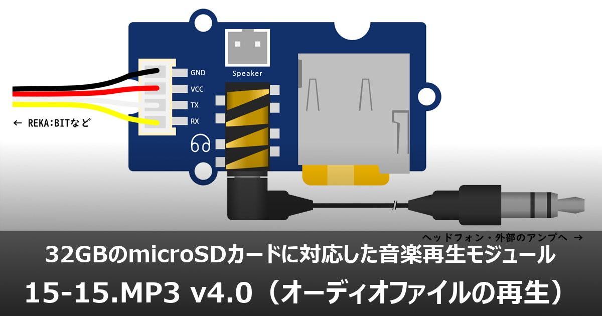 microSDカード(最大32GB)に保存したオーディオファイル(MP3・WAV・WMA)を再生するGroveモジュール[MP3 v4.0]について解説します。
