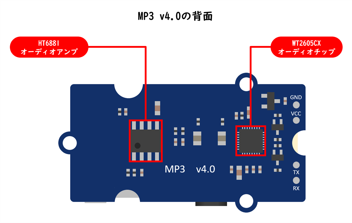MP3 v4.0には、WT2605CXというオーディオチップが搭載されています。このチップの制御は、シリアル接続を介したATコマンドの送信により行います。コマンドにより、オーディオファイルの再生・停止、音量設定などの操作が可能です。