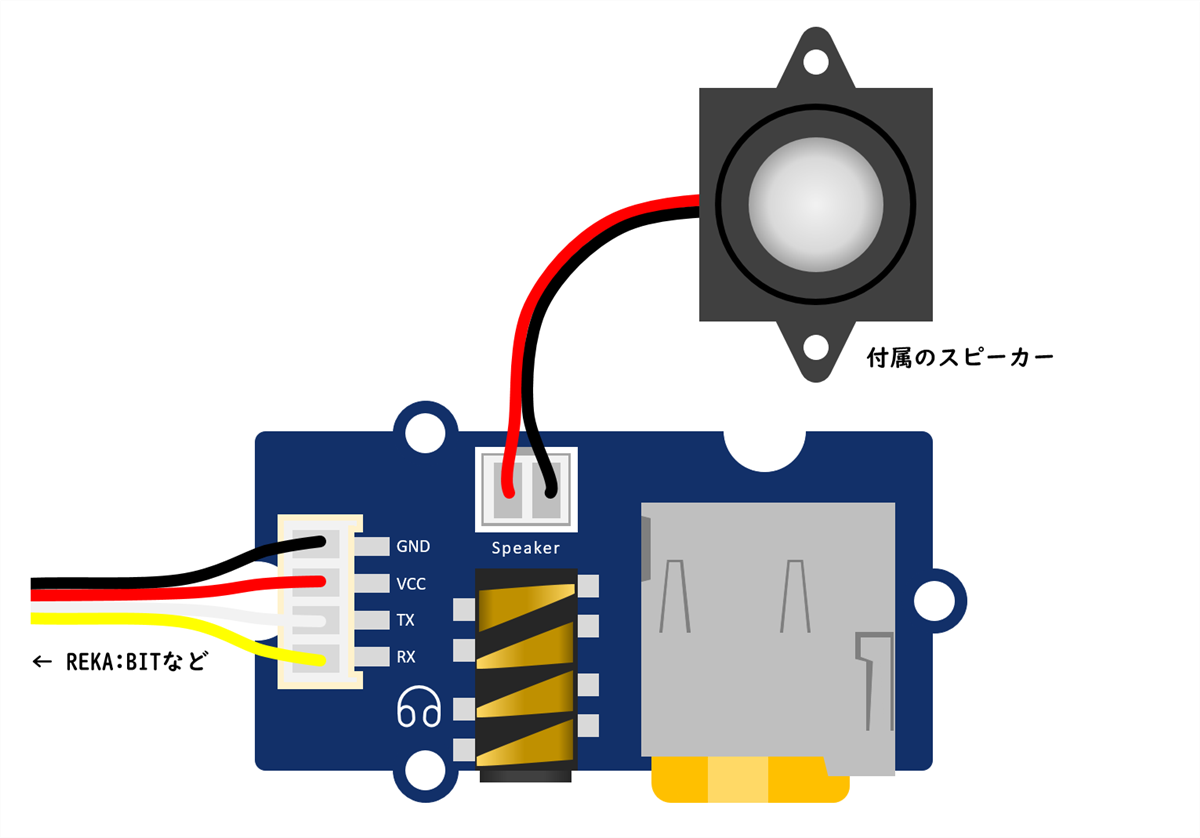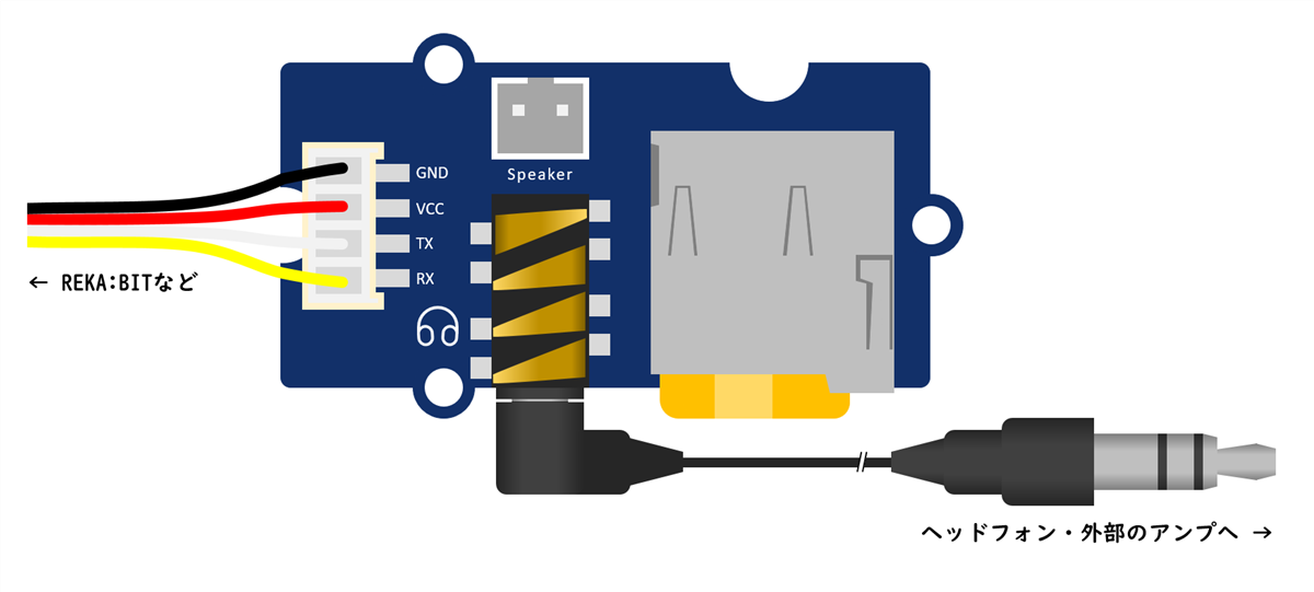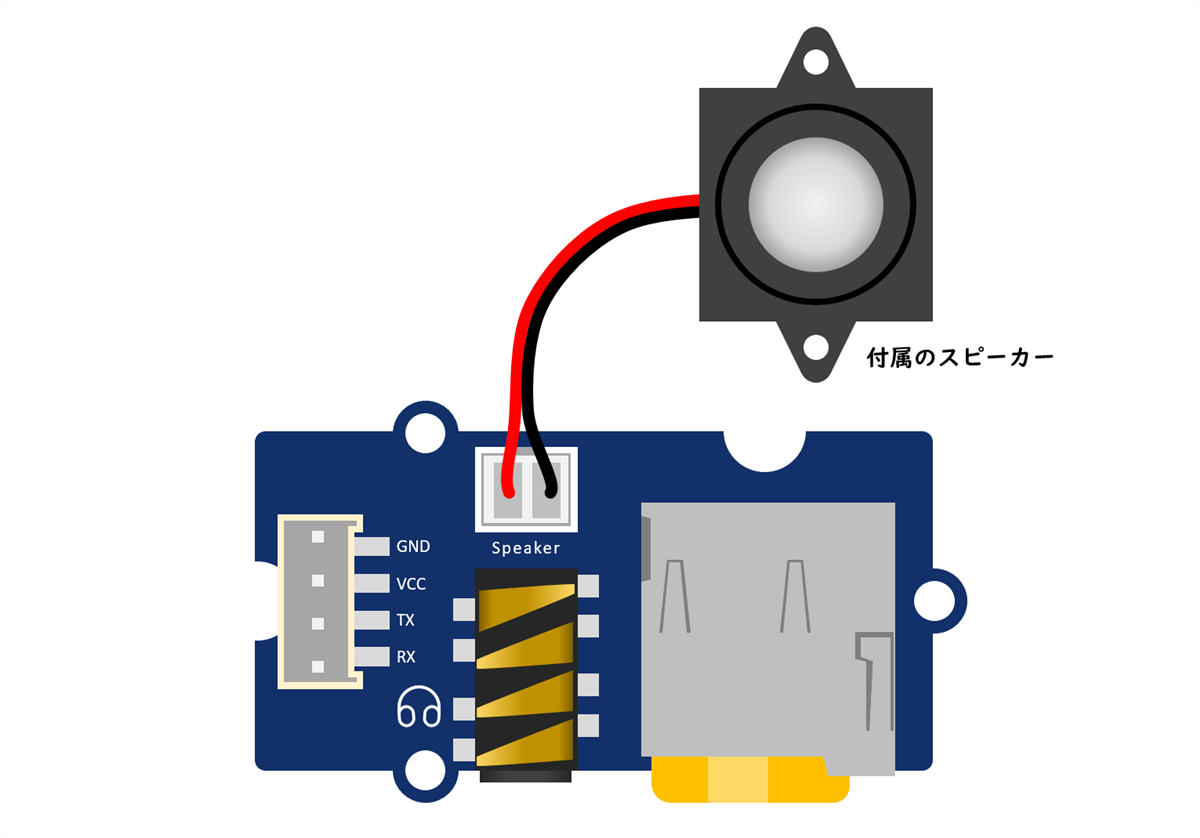 用途に合わせて、付属のスピーカー(モノラル)・ヘッドフォン・外部のアンプなどを接続します。付属のスピーカー(モノラル)は、スピーカー端子(JST PH/2P)に接続します。