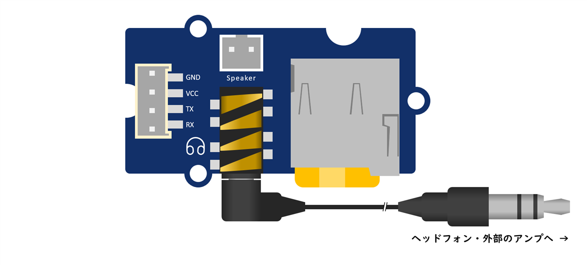 音声の出力インターフェースとして、スピーカー端子(JST PH/2P)とオーディオジャック(3.5mm/ステレオ)を搭載しています。用途に合わせて、付属のスピーカー(モノラル)・ヘッドフォン・外部のアンプを使い分けることができます。