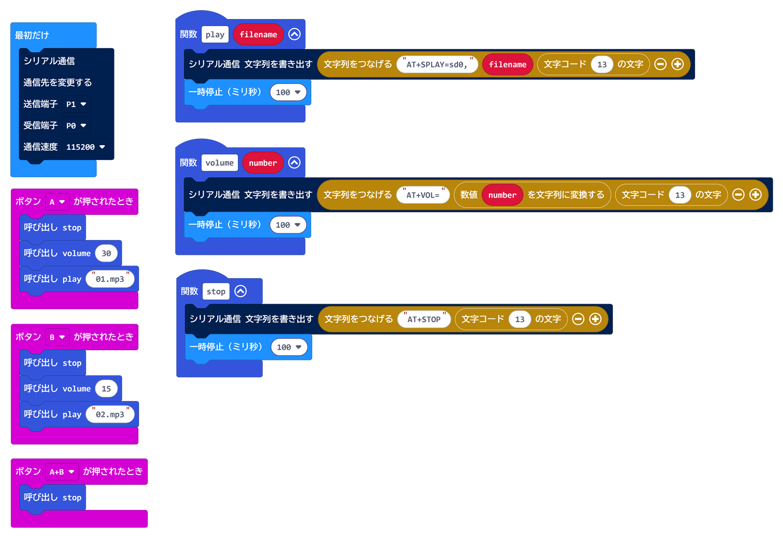 図2-7は、サンプルプログラムです。本プログラムでは、MP3 v4.0のRX・TXを、それぞれ拡張ボードのP0・P1に接続する仕様とし、関数としてオーディオファイルの再生(play)・停止(stop)、音量設定(volume)の3つを定義しました。