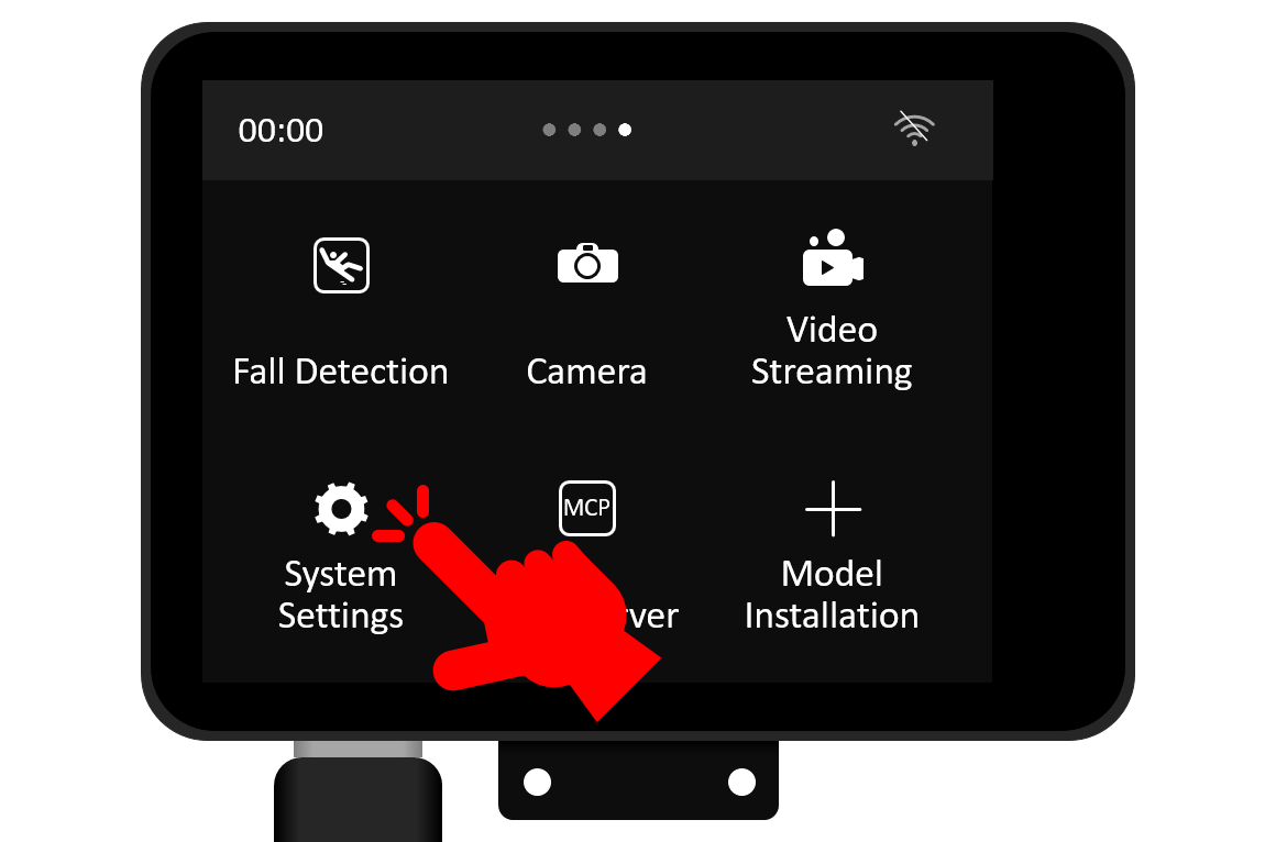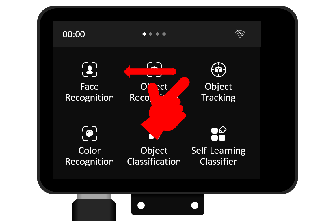 HUSKYLENS 2のディスプレイは、直接指で触れて操作するタッチインターフェースです。以下の操作でファームウェアバージョンを確認します。