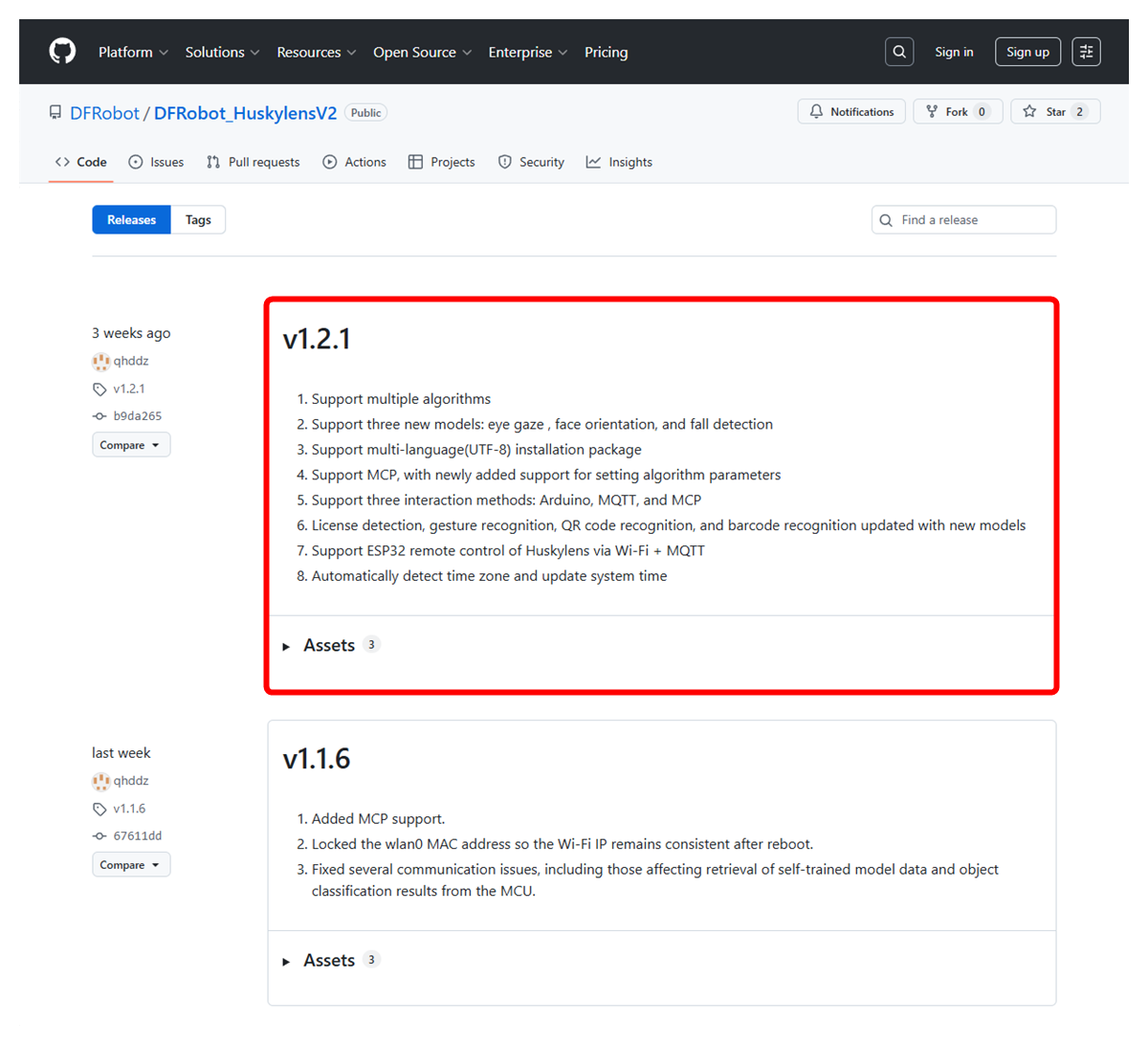 HUSKYLENS 2の開発元であるDFROBOTのGitHubリポジトリ(https://github.com/DFRobot/DFRobot_HuskylensV2/releases)にアクセスして、最新のファームウェアバージョンを確認します。この例では[v1.2.1]と表示されています。また、その下には、このバージョンで修正された内容や追加された機能など、変更点が一覧で表示されています。