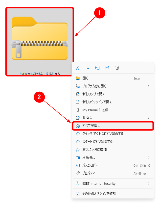 解凍するには、ダウンロードしたイメージファイルを右クリックして、表示されたメニューから[すべて展開...]を選択します。