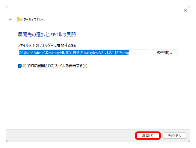 続けて、展開先を選択するウィンドウが表示されます。通常は、ダウンロードしたイメージファイルと同じフォルダーが展開先として表示されているため、そのまま[展開]ボタンをクリックします。展開先を変更する場合は、先に[参照]ボタンをクリックして、保存先のフォルダーを選択してください。