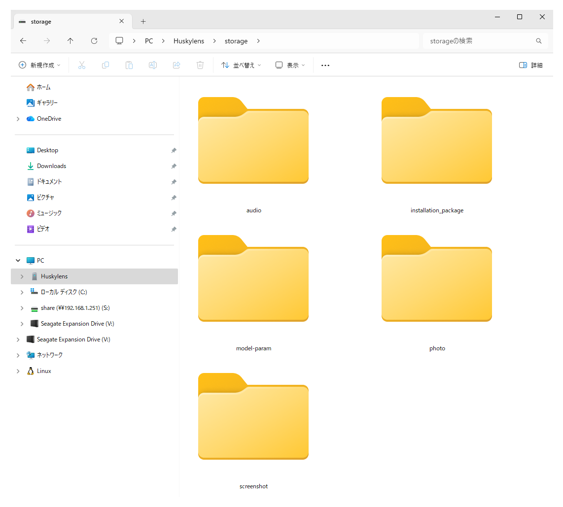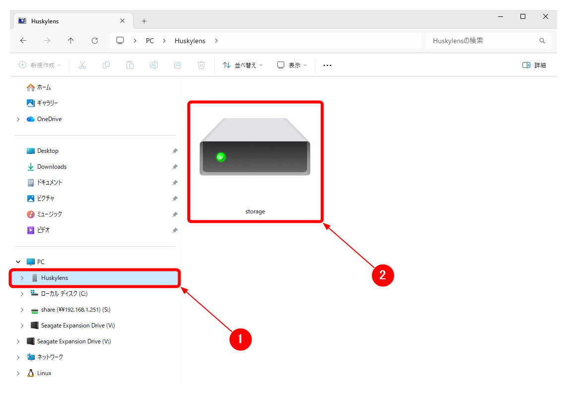 USBケーブルを使って、HUSKYLENS 2をパソコンと接続します。接続が完了し、HUSKYLENS 2が正しく認識されると、USBフラッシュメモリーとしてエクスプローラーに表示されます。表示名は[Huskylens]です。この[Huskylens]を選択すると、内蔵ストレージとして[storage]というフォルダーが見えます。この[storage]フォルダーを、さらに開きます。