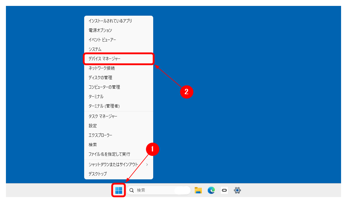 スタートボタンを右クリックして、表示されたメニューから[デバイスマネージャー]を選択します。
