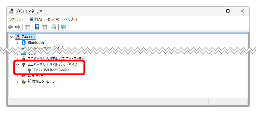 デバイスマネージャーの画面で[ユニバーサル シリアル バス デバイス]>[K230 USB Boot Device]となっていることを確認します。