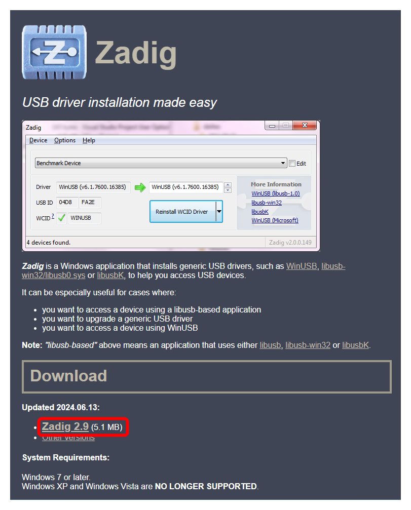 本手順では、Zadigを使ってデバイスドライバーのインストールを行います。Zadigは、USB機器に対応したデバイスドライバーのインストールを支援するアプリケーションです。ただし、使用方法を誤ると、デバイスやパソコンの動作に影響を及ぼす可能性があります。操作には十分に注意してください。