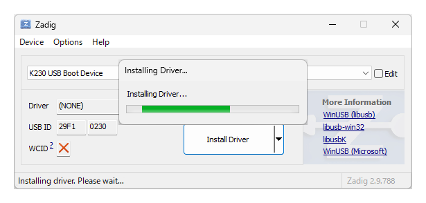 K230 USB Boot Device用デバイスドライバーのインストールが完了するまで、しばらく待ちます。