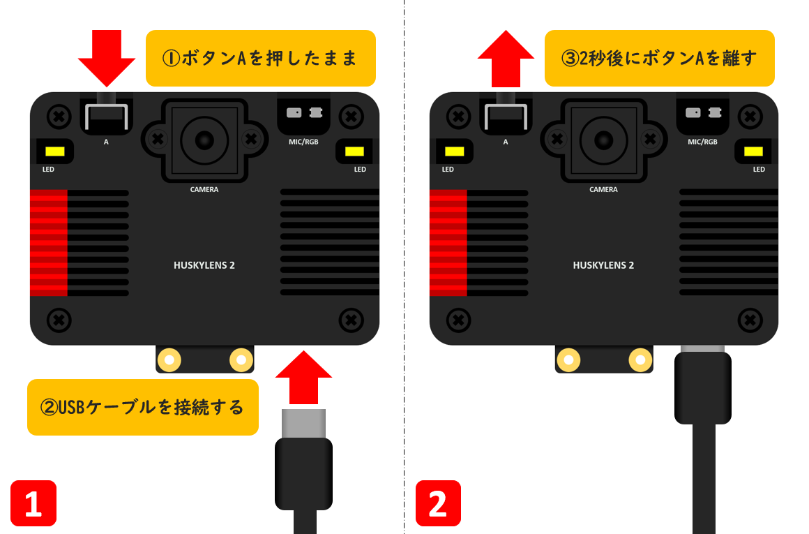 まず、USBケーブルの一方をパソコンに接続します。次に、HUSKYLENS 2のボタンAを押したまま、HUSKYLENS 2にUSBケーブルを接続します。約2秒後にボタンAを離します。HUSKYLENS 2のディスプレイに何も表示されなければフラッシュモードで起動しています。メニューが表示された場合は、通常モードで起動している状態です。その場合は、USBケーブルを抜いて、もう一度やり直してください。