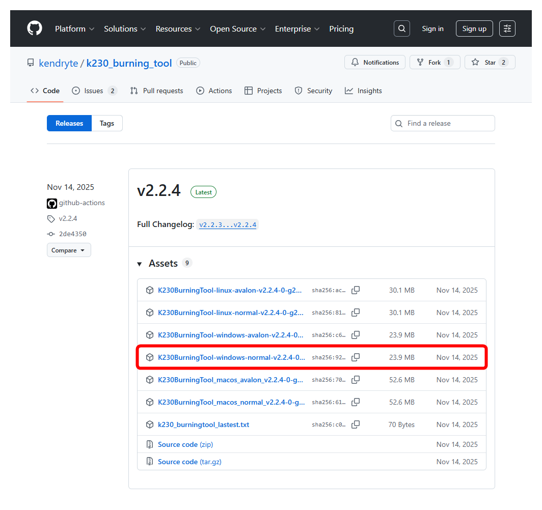 Kendryte(Canaan Inc.)のGitHubリポジトリ(https://github.com/kendryte/k230_burning_tool/releases)から、最新のK230 Burning Toolをダウンロードします。この例では[K230BurningTool-windows-normal-v2.2.4-0-g2de4350.zip]となります。