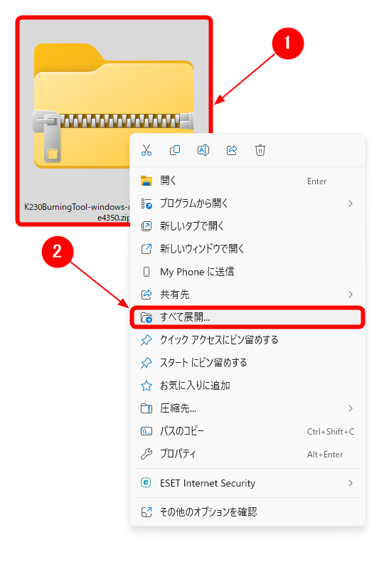 解凍するには、ダウンロードしたファイルを右クリックして、表示されたメニューから[すべて展開...]を選択します。