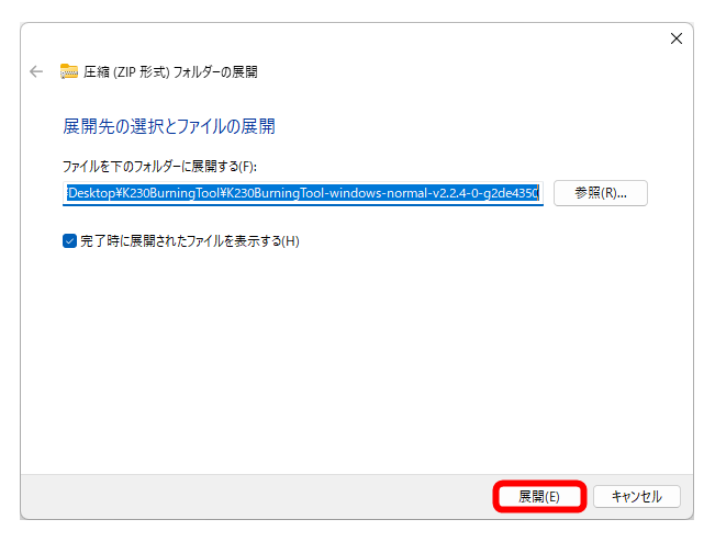 続けて、展開先を選択するウィンドウが表示されます。通常は、ダウンロードしたファイルと同じフォルダーが展開先として表示されているため、そのまま[展開]ボタンをクリックします。展開先を変更する場合は、先に[参照]ボタンをクリックして、保存先のフォルダーを選択してください。