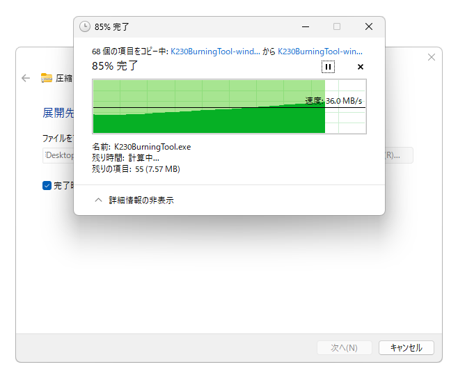 展開が完了したら、展開先で指定した場所に新しいフォルダーが作成されていることを確認します。この例では[K230BurningTool-windows-normal-v2.2.4-0-g2de4350]となります。