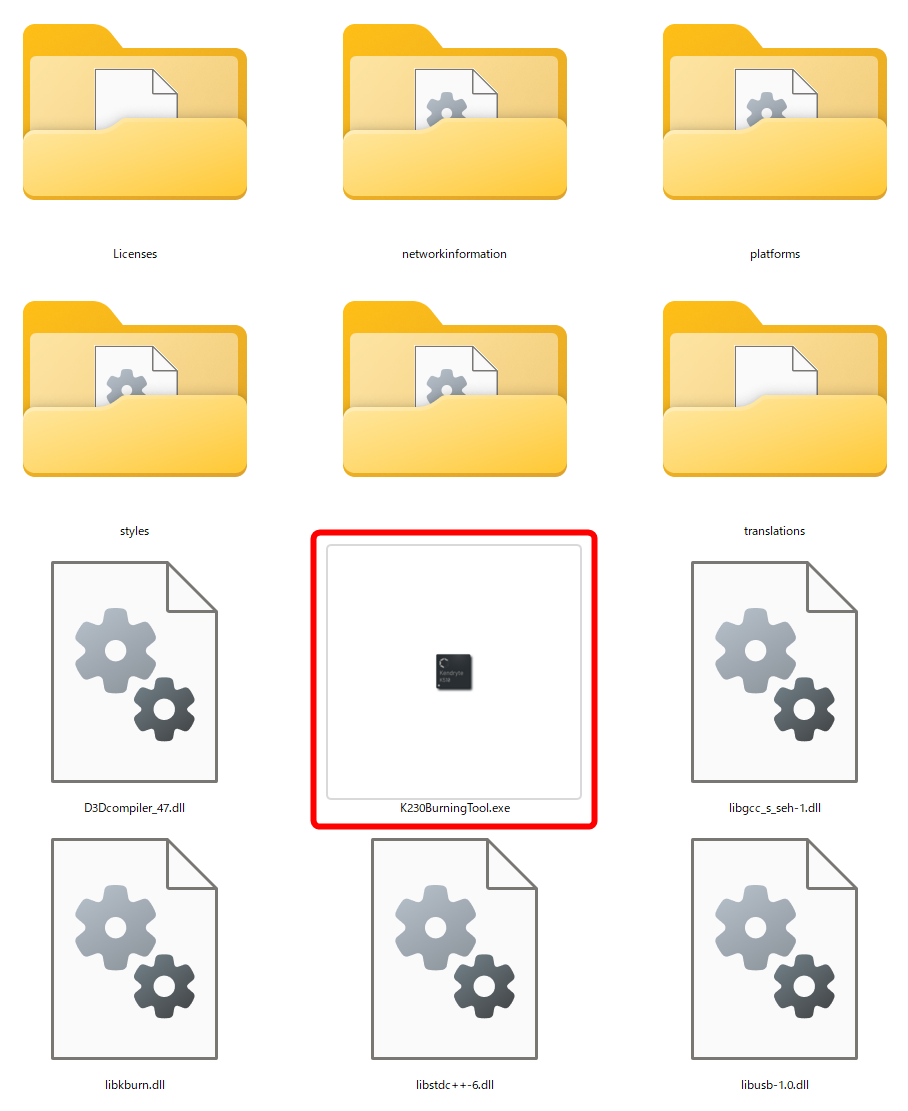 展開したフォルダー内の[bin]フォルダーを開き[K230BurningTool.exe]を実行します。
