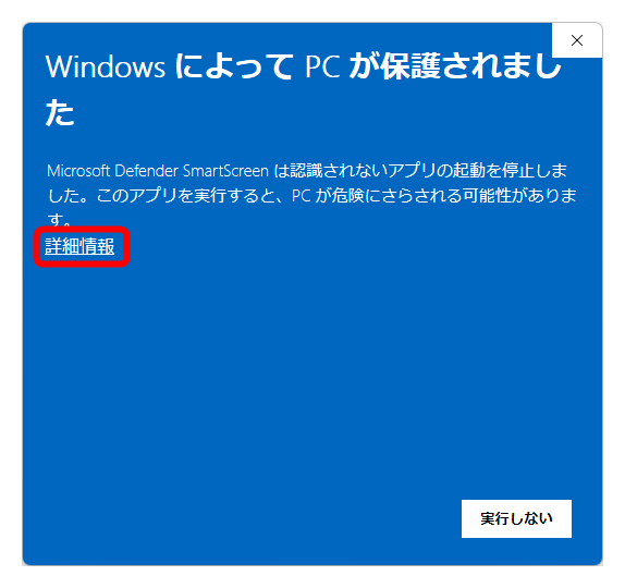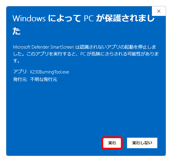 K230BurningTool.exeの実行時、次のようなメッセージが表示されることがあります。Windows Defender SmartScreenは、Windowsのセキュリティ機能で、ダウンロードしたファイルの発行元が不明なため、警告メッセージを表示しています。自己責任において実行する場合は[詳細情報]>[実行]の順番でクリックします。