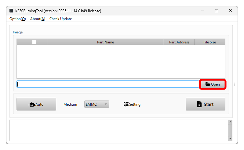 選択したイメージファイルの名前が表示されていること、書き込み先が[EMMC]になっていることを確認します。