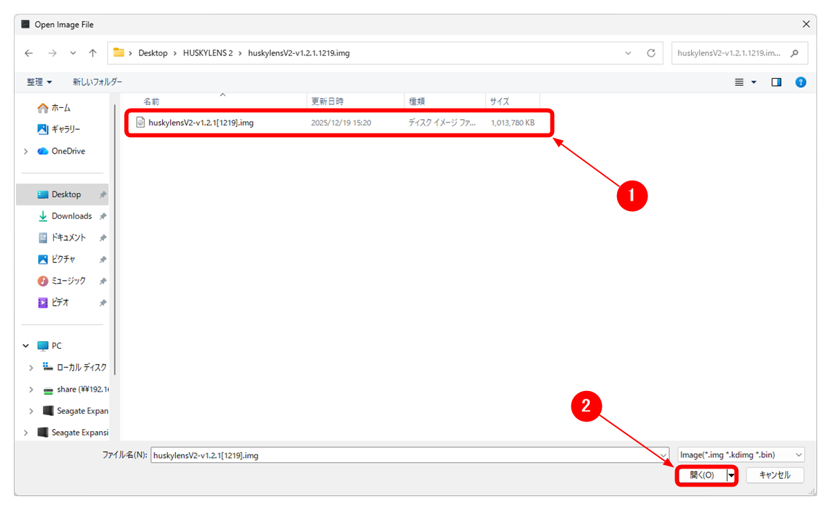 ファームウェアのイメージファイルを選択して[開く]ボタンをクリックします。この例では[huskylensV2-v1.2.1[1219].img]を選択しました。