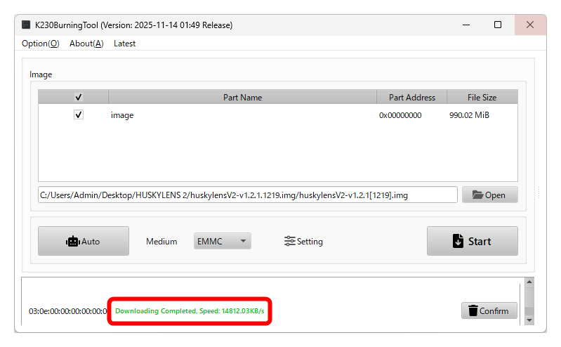 書き込みが完了したら[Downloading Completed.]のメッセージを確認して、K230 Burning Toolを終了します。