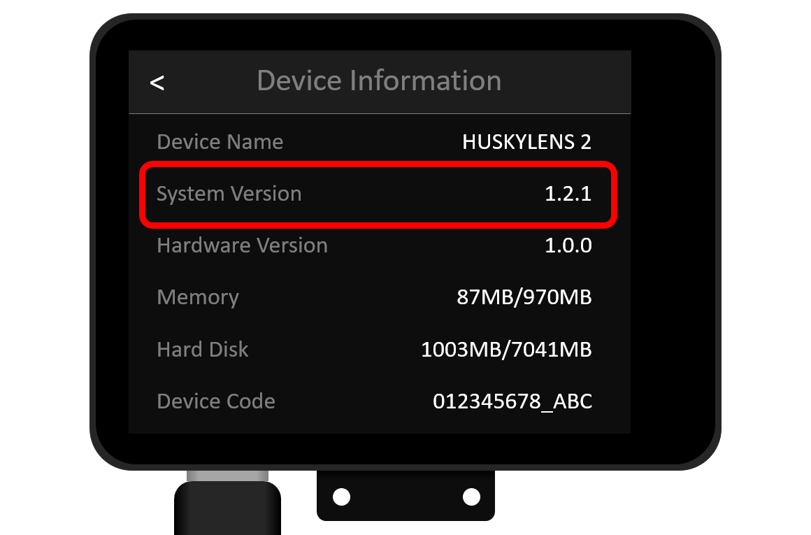 HUSKYLENS 2に接続されているUSBケーブルを一度抜き、再度接続します。HUSKYLENS 2の起動後、メニューから[System Version]の値を確認して、ファームウェアがアップデートされていることを確認します。本記事では[0.9.0]から[1.2.1]になりました。